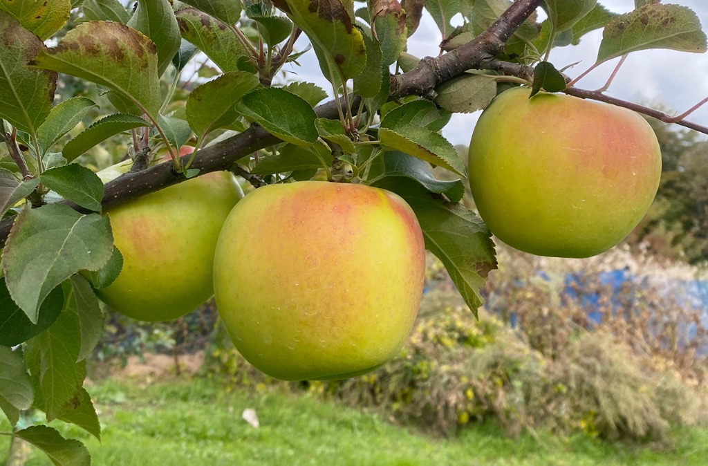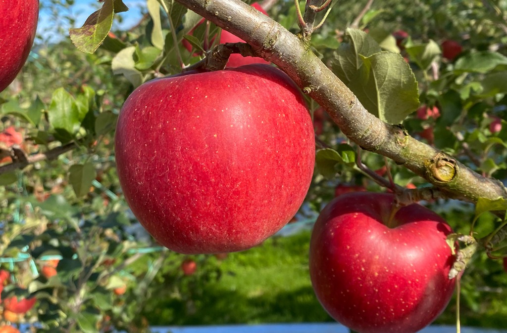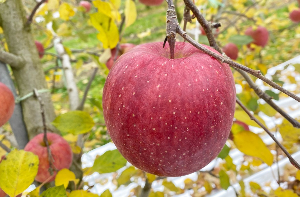 収穫時期:10月中下旬果重:300~350gと大きめ果皮:きれいな赤色味:甘味が強くてほどよい酸味があり、果肉はやや硬めで食味の良いりんご